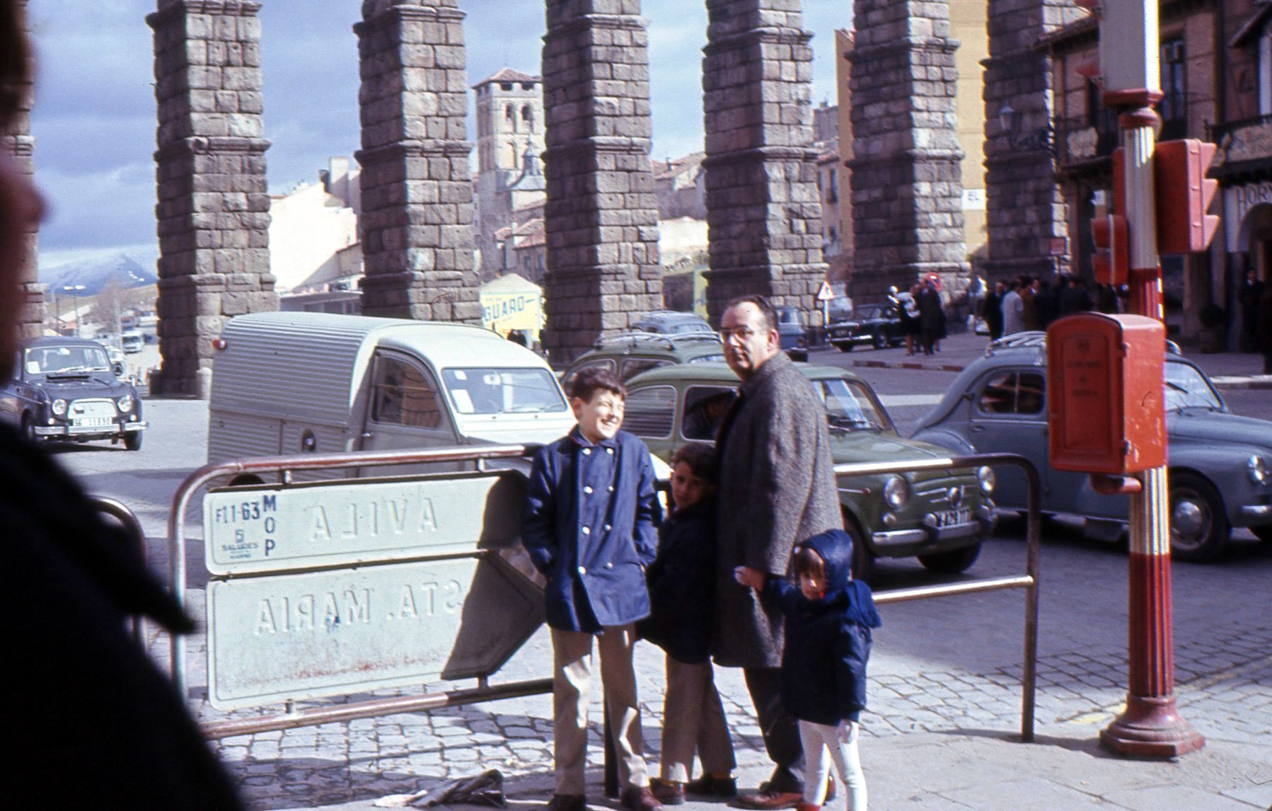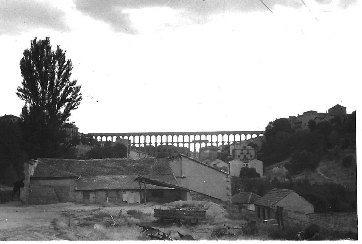 Y si observamos más enseguida nos daremos cuenta esa zona aledaña al gran acueducto romano no era entonces peatonal, como ahora, y los vehículos todavía podían circular bajo los arcos del mismo, e incluso aparcar a su sombra.