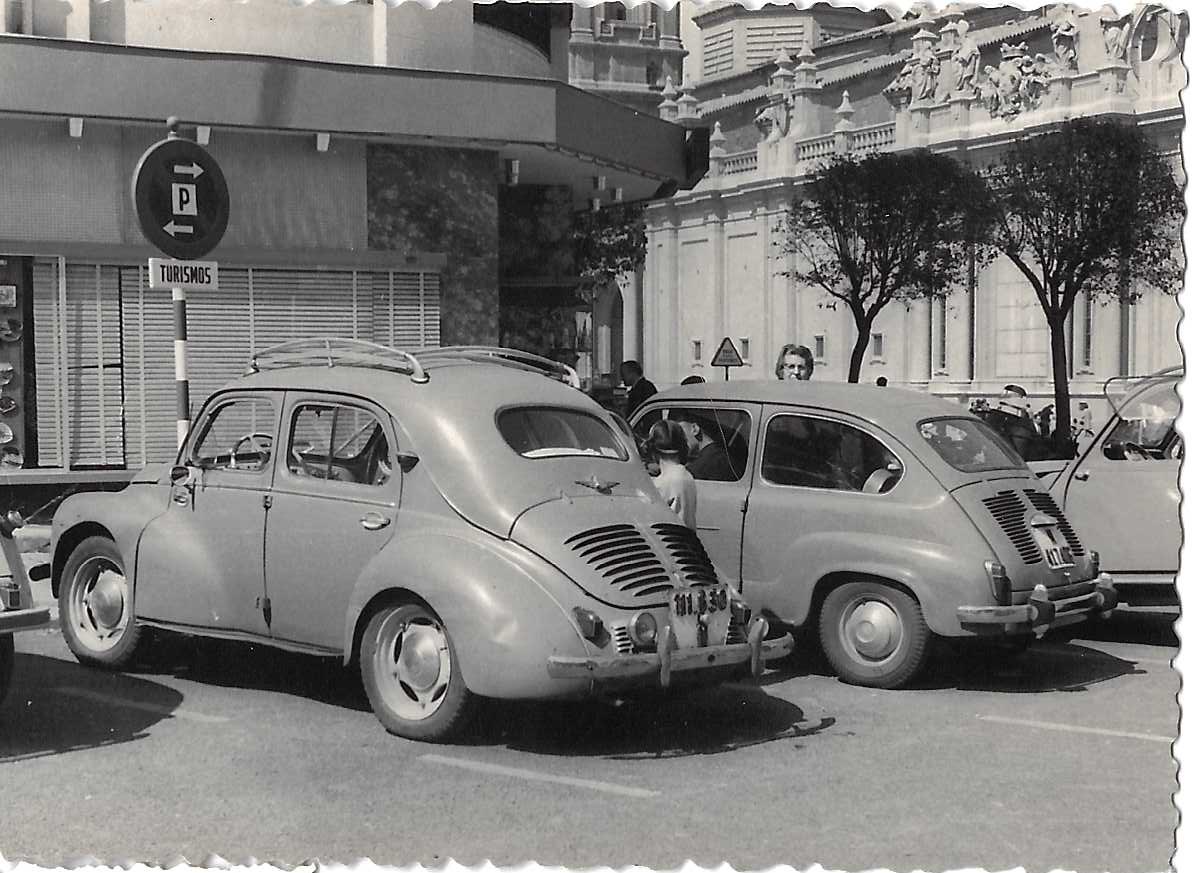 Fijándonos en los coches que se ven estacionados justo detrás de nosotros, identificamos una furgoneta 2CV de Citröen y a su izquierda y detrás, fijándose hay dos Seiscientos verdes, uno de ellos con baca que prácticamente no se ve, aparcado detrás, cerrándole el paso a un Renault 4CV (el popular cuatro-cuatro) azul también equipado con baca.